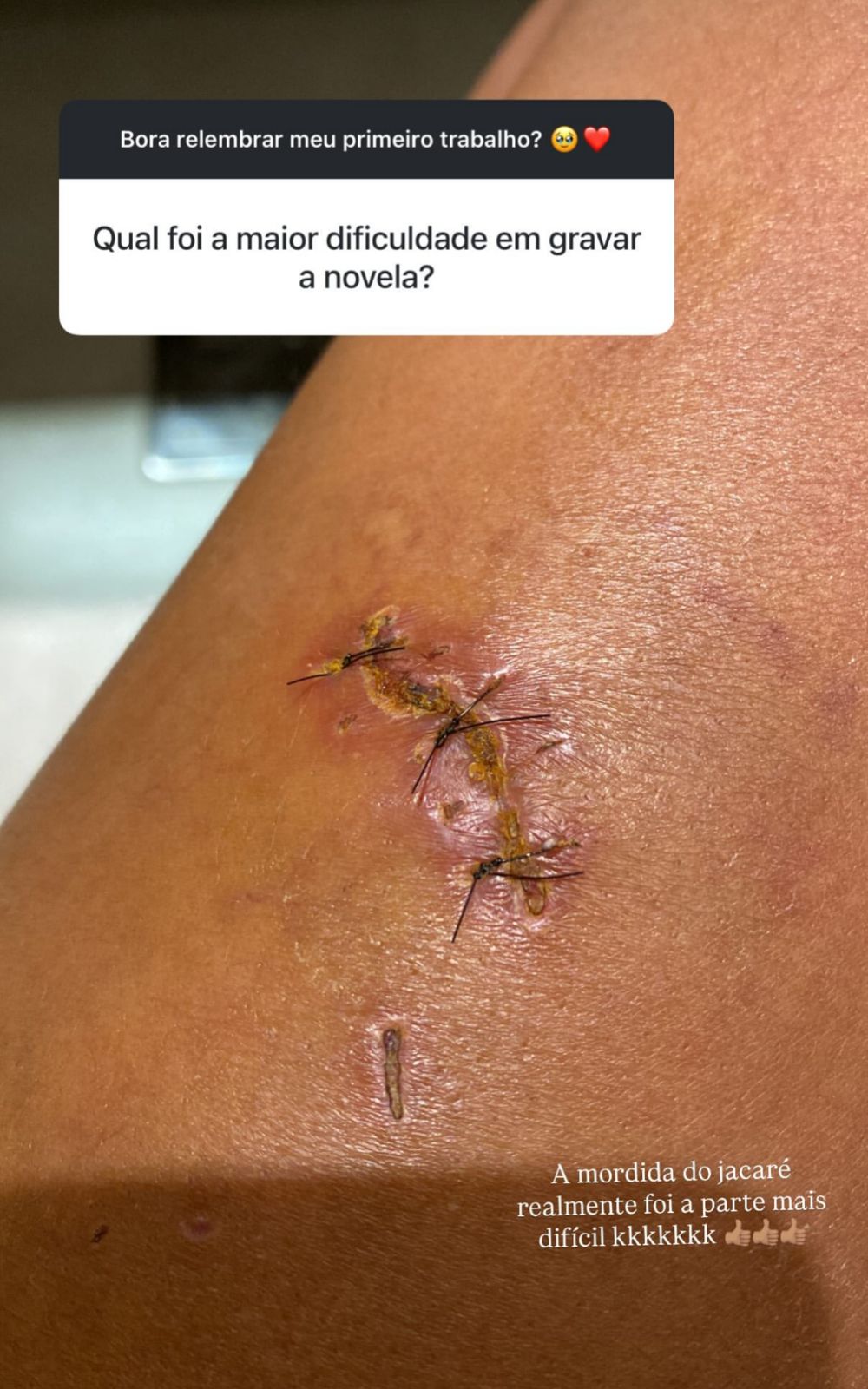 “A mordida do jacaré realmente foi a parte mais difícil [risos]”, confessou Bella, ao responder uma caixinha de perguntas nos Stories. A artista ainda resgatou uma foto da ferida, já com os pontos.