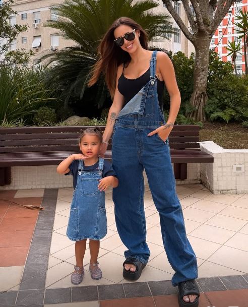 Bruna Biancardi posou com uma jardineira jeans combinada com uma blusa preta. Já a pequena Mavie, de 2 anos , vestia uma jardineira vestido, acompanhada de uma camisa escura. A influenciadora é conhecida por caprichar nas roupas de suas filhas.