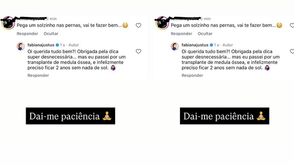 Fabiana continuou: “Mas eu passei por um transplante de medula óssea, e infelizmente preciso ficar 2 anos sem nada de sol”, finalizou Fabiana Justus, considerando as limitações estritas impostas por seu tratamento médico, ressaltou a influenciadora.