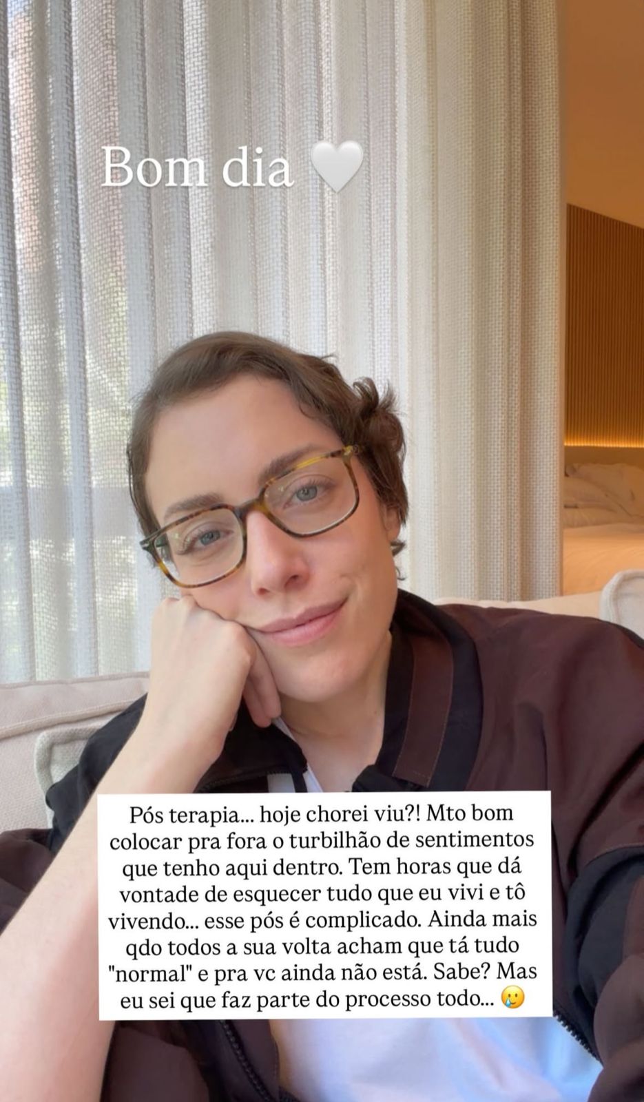 "Pós-terapia... hoje chorei viu?! Muito bom colocar pra fora o turbilhão de sentimentos que tenho aqui dentro. Tem horas que dá vontade de esquecer tudo que eu vivi e tô vivendo... Esse pós é complicado. Ainda mais quando todos à sua volta acham que tá tudo ‘normal’ e pra você ainda não está. Sabe? Mas eu sei que faz parte do processo todo", comentou ela.