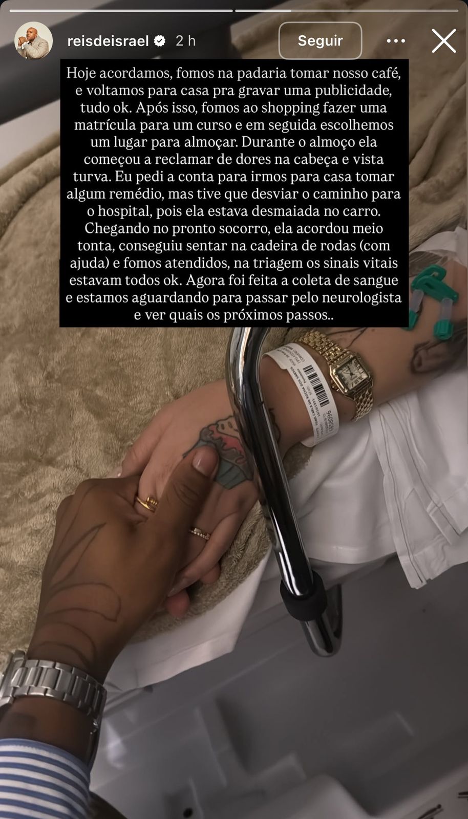 Logo em seguida, Israel postou uma foto segurando a mão da criadora de conteúdo e explicou o motivo da internação repentina dela: “Durante o almoço ela começou a reclamar de dores na cabeça e vista turva. Eu pedi a conta para irmos para casa tomar algum remédio, mas tive que desviar o caminho para o hospital, pois ela estava desmaiada no carro. Chegando no pronto-socorro, ela acordou meio tonta, conseguiu sentar na cadeira de rodas (com ajuda) e fomos atendidos. Na triagem os sinais vitais estavam todos ok”, contou.
