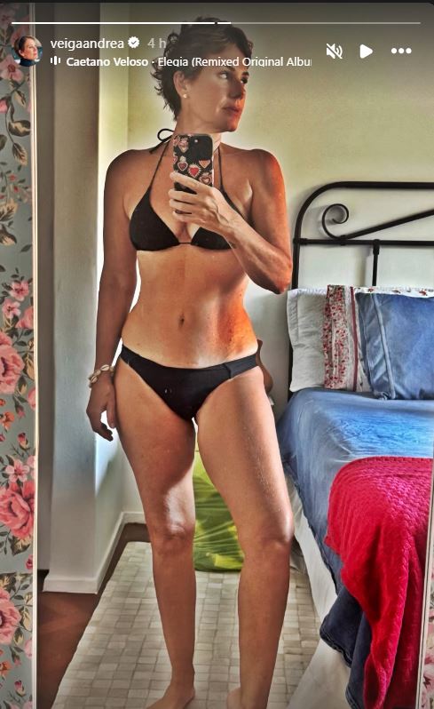 Aos 56 anos, Andréa Veiga exibe corpo em biquíni preto; veja a foto