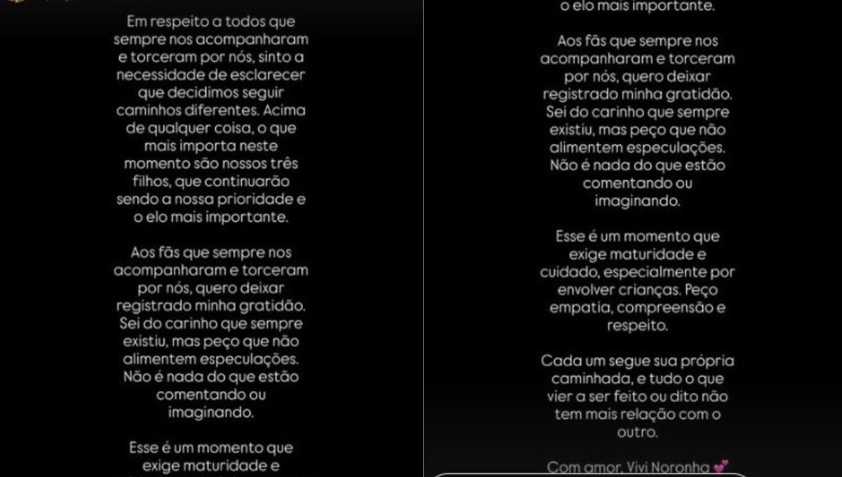 “Em respeito a todos que sempre nos acompanharam e torceram por nós, sinto a necessidade de esclarecer que decidimos seguir caminhos diferentes. Acima de qualquer coisa, o que mais importa neste momento são nossos três filhos, que continuarão sendo a nossa prioridade e o elo mais importante”, começou a influenciadora.
